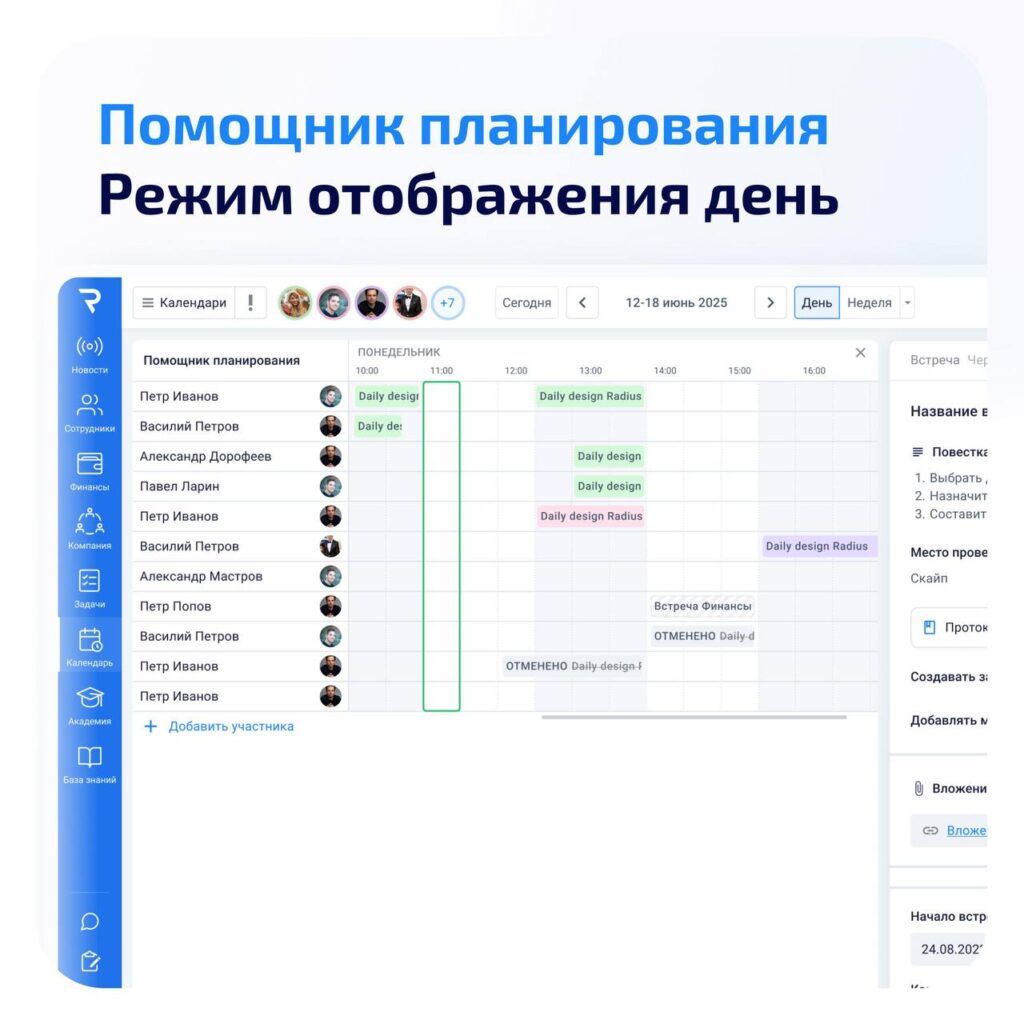 Мы обновили дневной режим календаря. Теперь расписание сотрудников отображается по часам, а подбор времени для встреч стал нагляднее и проще.