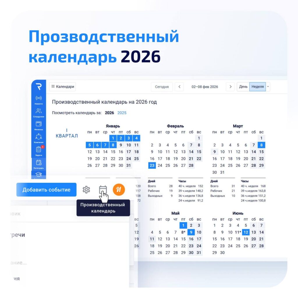 В систему добавлен официальный производственный календарь на весь 2026 год. Теперь планировать отпуска и рабочие периоды можно прямо внутри «Мой Радиус», без дополнительных сервисов.