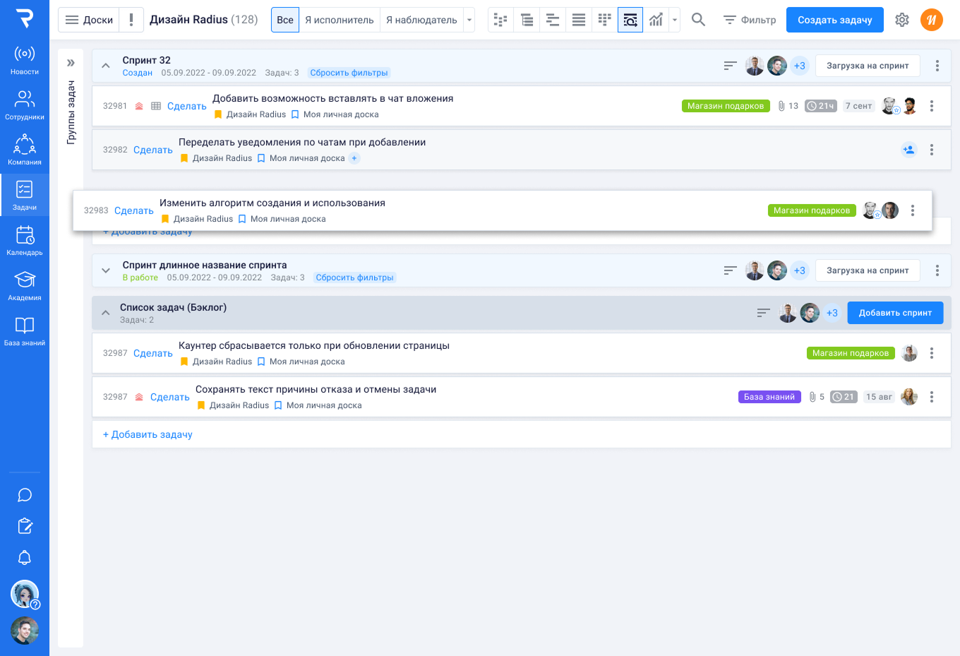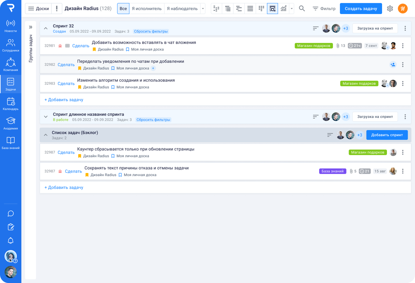 Все задачи спринта отображаются в одном месте, что делает планирование и контроль работы команды максимально прозрачными.